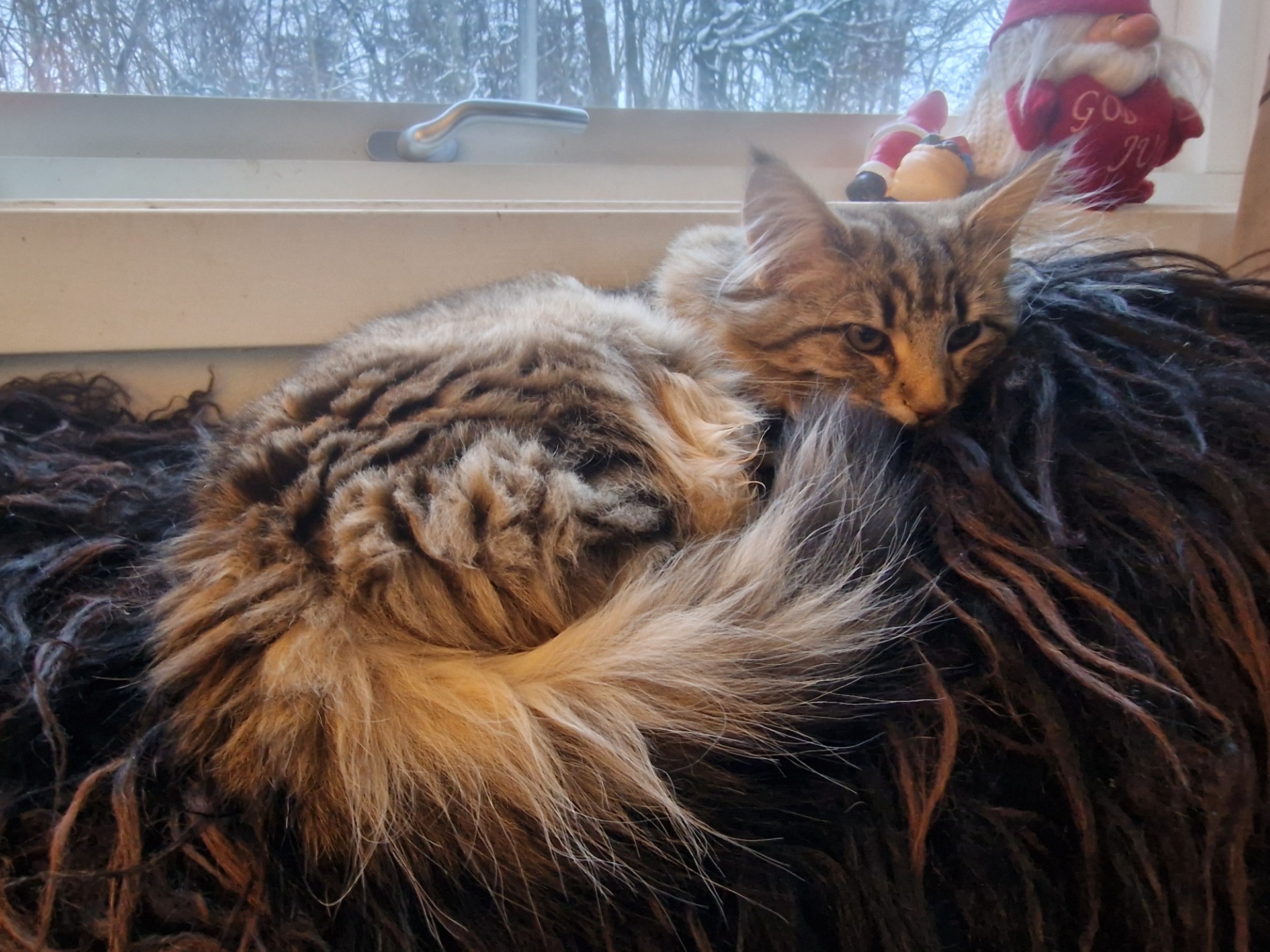 Alva is our first homemade breeding cat, from the A-litter. She is a magnificently cuddly and trusting ball of fur that preferably wants to settle down as close to your face as possible. Enjoying the outdoors as much as the indoors, she is on track to become a proper farm-cat.